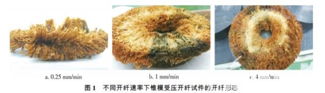 軟化處理后的竹筒在開纖試驗(yàn)機(jī)中以開纖速 率為單一變量進(jìn)行錐模受壓開纖試驗(yàn),各試件的開 纖形態(tài)如圖 1 所示。