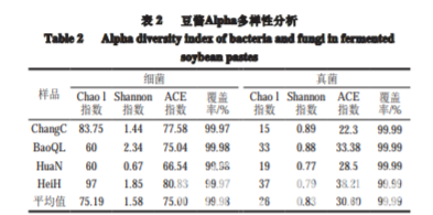 OTU分析后,分別計算各Alpha多樣性指數。由表2 可知,4 份豆醬樣品細菌的Chao l指數平均值為75.19, ACE指數平均值為75.00,Shannon指數平均值為1.58。 4 份豆醬樣品真菌的Chao l指數平均值為26,ACE指數 平均值為30.60,Shannon指數平均值為0.83。從Chao l和 ACE指數可以看出,豆醬樣品的細菌菌群豐度高于真菌 菌群豐度。從Shannon指數可以看出,豆醬樣品的細菌物 種均勻度高于真菌物種均勻度。因此,傳統豆醬中細菌 菌群多樣性更加豐富。