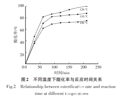 為了探討反應溫度對羥基與酸酐基團酯化反 應的影響,本文考察了不同溫度下酯化率隨溫度的 變化關系,結果如圖2所示。由圖2可知:在熔融攪拌條件下,反應體系在前 一個小時快速反應至轉化率 60%以上,但是在較低酯化溫度(100 ℃)下,即使延長反應時間,轉化率難 以達到 80%。而在較高溫度(120 ℃)下反應較快, 酯化率很快達到 90% 以上,后期轉化率超過 100%, 這可能是由于高溫下鄰苯二甲酸酐會升華所致;同 時在高溫下 PEG 可能易被氧化,導致副反應發生, 體系顏色加深。故酯化選取110 ℃作為合適的反應 溫度,反應時間為2.5 h。